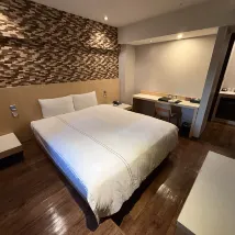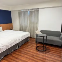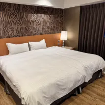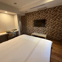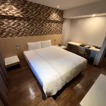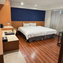 床墊偏硬,枕頭支撐力不足,但不影響睡眠。隔音效果很好,因為住在7樓,所以聽不到交通噪音。 我睡覺時關燈,但醒來後燈會自動亮起。基本設施齊全,空調冷氣效果好,燈光也很舒適。浴室寬敞,但淋浴區的排水有點慢,每次洗完澡都會積水。 大廳很大,有飲水機和沙發。飯店位置就在宜中街夜市附近,步行範圍內有四家素食餐廳和一家自助洗衣店。總的來說,入住體驗不錯,推薦👍
