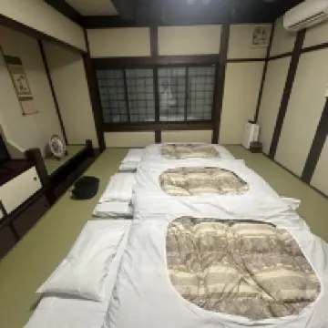 這家日式旅館位於城外一個安靜的區域。輕鬆步行即可抵達泰迪熊博物館、您可以參觀的貓咪保護區和飛彈民俗村。 如果您想在免費接駁車時間之外出行,靠近巴士站。 工作人員非常友好和樂於助人。隔天早上(主人)注意到我一跛一跛的很厲害。吃早餐的時候,她非常友善地走過來,給了我一些治療腳踝的貼片。我很感激,也很感動她的體貼。 早餐可選擇西式或日式。它被帶到你的餐桌上,而且數量很多。很高興每天早上都有不同的餐點。 不幸的是我們沒有時間使用溫泉,因為我們經常外出。他們有公共的和私人的(為了隱私而把自己鎖在裡面)。 頂樓的房間一塵不染,有自己的淋浴和浴缸(附盥洗用品),有足夠的休息空間,有冰箱、熱水機、電視和非常舒適的床墊。 因為周圍都是樹木,所以非常安靜。 我會推薦這家中檔日式旅館。