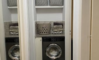 公寓設有一個小型洗衣區,配備洗衣機、熨斗和熨衣板,陽台上設有晾衣架。