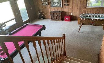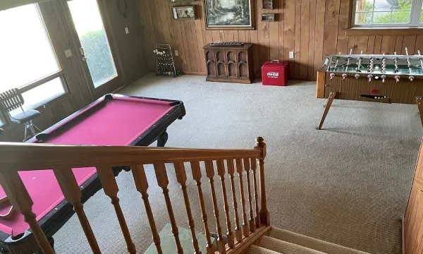INDOOR LIVING: open-concept layout, lake decor, 6-person dining table in kitchen + 2 bar stools, 4 person table in family room, Play Room w/full size pool/ping pong table, Foosball Table