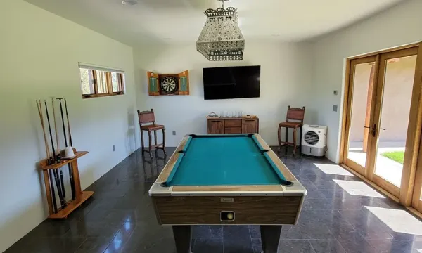 150+ year old fully renovated authentic hacienda style home with a private outdoor courtyard surrounded by two fully independent and equipped casitas, a game room with an office, and large main house connected with a covered walkway, complete with an outdoor kitchen/grill area and gas firepit that seats 6-8. Owned and operated by descendants of the original owner from the 1800's, this house was restored to its original Native American and Hispanic architecture, complete with modern amenities and new appliances. The house features views of Taos Mountain to the north, the Picuris Mountains to the south, and has an existing corral with horses and cattle (at a safe distance of course!). Located 2.5 miles from Taos Plaza, and a half hour drive from Taos Ski Valley, this house makes for the perfect family getaway in beautiful Taos, New Mexico.About pets:No pets allowed.About checkOut:Check out before 12:00 PM.About children:Children allowed: ages 0-17.About checkIn:Check in after 3:00 PM.About smoking:Smoking allowed: in designated areas.About minBookingAge:Minimum age to rent: 25.About events:No events allowed.