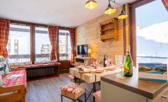 Tignes Val Claret: Residence "Le Prariond" - excellent location: central but quiet, right by the Tignes and Val d'Isère slopes, ski in ski out. Apartment block "Le Prariond (Val Claret)". In the centre of Val Claret, in a sunny position residential area (villas). In the complex: lift, storage room for skis, central heating system. Supermarket 250 m, shopping centre 50 m, restaurant 50 m, bakery 50 m, 5 minute walk to the centre, bus stop 250 m, indoor swimming pool 800 m. Sports centre 800 m, chair lift, skisport facilities 15 m, ski bus stop 250 m, ski school 20 m, ski-kindergarten 150 m. Nearby attractions: Funiculaire de la Grande Motte -en ski 200 m. Well-known ski regions can easily be reached: TIGNES VAL D'ISERE 100 m. Please note: ski bus (free of charge). In case of good snow conditions, the house is accessible on skis. Guarded residence. The keys‘ handover takes place by the agency Interhome in Tignes Val Claret. 2-room apartment 40 m2 on 4th floor. Renovated, comfortable and beautiful furnishings: living/dining room with 1 pull-out bed (2 pers. 2 x 80 cm, length 190 cm), TV (flat screen). Exit to the balcony. 1 room with 1 french bed (140 cm, length 190 cm). Entrance hall with 1 x 2 bunk beds (80 cm, length 190 cm). Kitchen (mini-oven, dishwasher, 2 ceramic glass hob hotplates, kettle, microwave, electric coffee machine). Bath/WC. Balcony 8 m2, west facing position. Very beautiful panoramic view of the mountains and the ski run. Please note: non-smokers only. Smoke alarm.