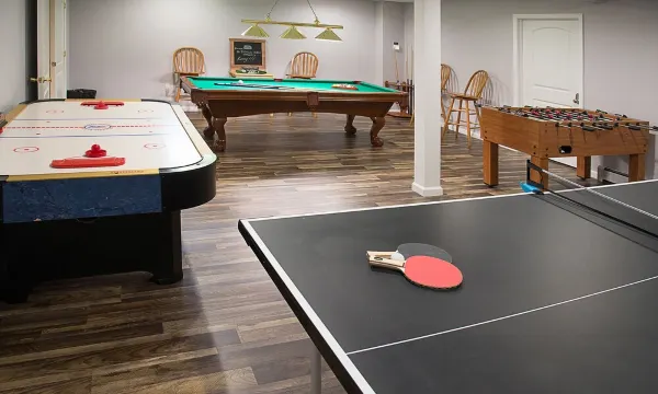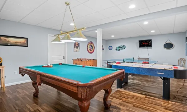 Game room includes pool table, ping pong table, foosball, air hockey and poker table. Enjoy our large deck with 2 patio dining sets, gazebo with additional outdoor seating and fire pit. Outdoor games, badminton, corn hole toss and Horse Shoe. Our private property is beautifully landscaped and boasts a tranquil pond with waterfall.