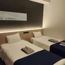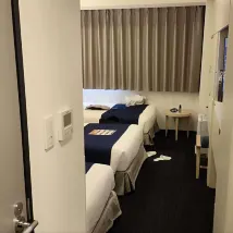 雖然離車站有點遠,但附近設施齊全,例如24小時營業的永旺超市、7-11便利商店、Komeda咖啡店和羅森便利商店!對於我這種只需要住一晚,從清晨到深夜還要跑腿的人來說,這家旅館真是太方便了,我對此心存感激。我原本預訂的是三床房,但前台說他們幫我升級了房間。到了房間,發現是兩張床加一張沙發的房間,所以也不知道是不是真的升級了。