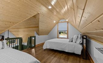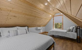 Escape to our brand-new, two-story treehouse nestled in nature, offering the perfect blend of rustic charm and modern comfort. This one-of-a-kind cabin-style retreat features 2 cozy bedrooms, including a loft accessed by a fun climb up a ship’s ladder. With 3 beds, it comfortably sleeps 5 guests, making it an ideal getaway for families or friends.