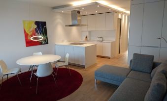 The living area with integrated Bulthaup kitchen, sofa bed by Bruehl and modern dining area, invites you to enjoy the view of the Baltic Sea, either from the outside of the balcony, or from the inside through the panoramic window.