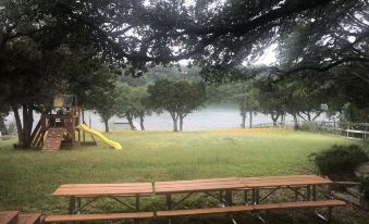 Home is a Rustic Hill Country Lake House-very casual with multiple interior areas for gathering and plenty of outdoor space to play and relax. Fire pit at the waters edge.