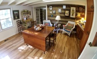 Step into a piece of history, where the charm of the past meets the comfort of modern amenities. Our cozy cabin is split into two sections, connected by a charming enclosed breezeway. One side preserves the rustic charm of the original log cabin, while the other features a modern addition with a fully updated kitchen, outfitted with state-of-the-art appliances, making home-cooked meals a delight.