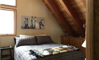 The living space is bright and roomy, with towering ceilings and large windows that frame the trees. Planning a quiet night in? You'll have WIFI, a wood burning stove, complete with wood, a large hearth with seating around, a sofa which pulls out to a queen sized sleeper; a flat screen tv; which also includes cable, a DVD player, Netflix; and a selection of adult and kid games to keep you entertained.