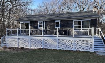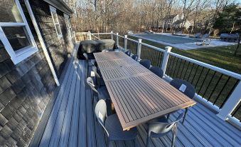 Enjoy this large cottage tucked away in the Tuckahoe woods. With 5 bedrooms and 3 bathrooms, this is the perfect getaway home for families or friends looking to spend time with nature, and be within a 10 minute drive to shopping, the best beaches, and the Southampton scene. The backyard is an outdoor paradise, with large seating areas on a sprawling deck, a fantastic Olympic-sized pool, brand new outdoor grill, a hot tub (or cold plunge!), an outdoor shower, lots of space to throw around a frisbee or baseball, and a firepit surrounded by magical solar lights. The house is recently fully renovated, with all of the amenities you need to enjoy your stay. With stunning hiking trails just a stone's throw from the house, you can truly experience the Hamptons lifestyle however you choose-- be it a woodsy retreat in nature, or a bougie trip to one of the most exciting towns in the Hamptons.
