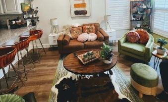 Located in Historic Mill Town and near the famous rail tracks of Tupelo, step right on in and open the plantation shutters to a light and bright brand- new bungalow cottage filled with mid -century modern, bohemian and 70’s Hippy vibes. You will find a record player with some 70s and other good music, a few lava lamps, a salt rock lamp, and lots of conversation pieces.
