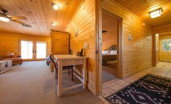 The cabin is 1100 square feet with 2 large rooms, a kitchen, bathroom, and washer/dryer area on 5 acres with our residence. The king size Earthing bed is all natural and super comfortable. It grounds you to the earth's energy for a great night sleep. Snuggle under the down comforter. Pick a book from our library and read by the Tiffany lamps. Living area has a hand carved wood table, sleeper sofa and a leather chair. Board games and cards are provided.