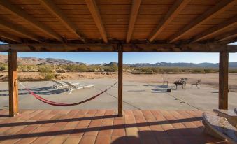 This is a beautiful 1100 sq. ft. cabin on 5 acres on the border of the Joshua Tree National Park that affords privacy and tranquility. The view is amazing. Although you can take the opportunity to visit the park, hike, climb, etc. Many people just stay and relax at the cabin, swimming in the pool and soaking in the jacuzzi.