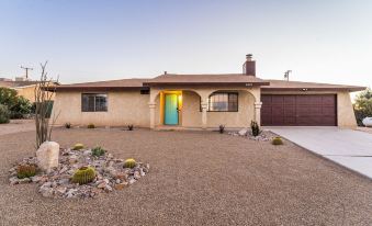 Our home is centrally located within walking distance to the 49 Palms entrance to the Joshua Tree National Park, one of the favored hiking trails in our area. Comfortable living room offers a cozy fire place for winter nights. Large view windows with Eastern views allow for sunrise enjoyment. Two spacious bedrooms and two full baths. The back patio is the perfect place to gather and enjoy the Desert days. Only 3 miles to the Indian Cove Ranger Station and Entrance to the National Park.About pets:Pets allowed: dogs less than 20 lbs per pet (limit one pet total).About checkOut:Check out before 11:00 AM.About children:Children allowed: ages 0-17.About checkIn:Check in after 4:00 PM.About smoking:Smoking is not permitted.About minBookingAge:Minimum age to rent: 25.About events:No events allowed.