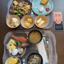 飯店都是自助式服務的,但是設備都還蠻直觀好操作,所以可以放心不會有看不懂或是不知道怎麼辦理的問題距離迪士尼其實是有一段距離的至少20分鐘的車程,所以以距離來說我會給四顆心推薦有來住的大家一定要吃吃看飯店的早餐飯店的早餐還蠻健康的,而且種類的選擇很多竟然有綠色的蕃茄是我在台灣沒有吃過的還有生魚片切丁的丼飯鮭魚和煙燻鮭魚也都非常好吃推薦給大家可以先吃飽再去迪士尼會更有活力在樂園的時候就不用再花時間排隊買東西吃