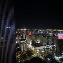 酒店前台在46樓,高峯期等電梯你需要等很久,上下樓很不方便,酒店有自己的停車場需要你打電話,周邊各種吃的應有盡有燒烤 特產 水果店 。客房服務人員也不換床單