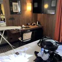 房間是真的小,還不如國內的快捷酒店大,就這還算是四星標準的酒店,房間裏連個28寸的行李箱都放不下,雙人床都是一米五的,都沒個一米八的,也不知道那些歐洲胖子夫妻兩個怎麼擠的,翻個身就掉地上了。地下車庫也就能放五六輛車,入口非常窄,地下車庫內也很矮,弄不好就碰頭。早餐也很簡單,就是些煎蛋培根麪包果汁之類的。不過這家酒店的地理位置還不錯,就在鎮上,離凡爾賽宮走路十幾分鍾,地鐵站走路也十幾分鍾,周邊飯店吃的還比較多,附近200米還有個超市,樓下幾十米還有個自助投幣洗衣房。