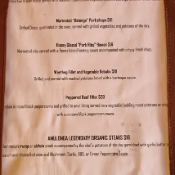 Our meals exceeded our expectations, with fabulous service and ambience of the restaurant. We had the warthog kebabs, vegetarian kebabs, chicken schnitzel and the bream fillets with garlic butter sauce and salad. We all thoroughly enjoyed our meals, as well as Pina coladas and gin and tonics. They also provide some traditional African dancing for entertainment. A further highlight was an elephant strolling through the grounds of the restaurant - what a treat! Highly recommended eating venue.