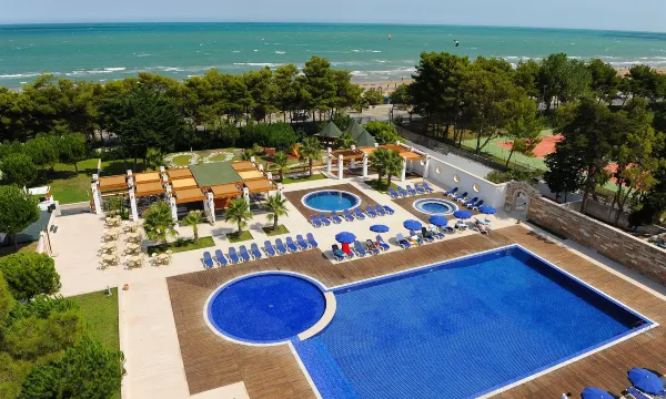 Albergo bello, imponente, un po' datato, con qualche ruga. Ambienti bellissimi e ampi, piscine, giardini, bar bordo piscina e nella spiaggia privata, personale gentile e disponibile. Ottima colazione. Direi tutto pregevole se non fosse per l'esperienza della cena nel ristorante interno. Non menù da quattro stelle, ma ristretto menù del giorno tipo pensione riminese con quattro scelte obbligate per primi e secondi. Porzioni minime; antipasto di pochi pezzetti di polpo duro e persino secco ai bordi (passaggio in forno a microonde?) su letto di patate. Secondo; piccolo pezzetto di ombrina secca con purè di patate e verdura. Dessert; coppa con palline di gelato o bavarese. Punto. O questo o quello. Gran tristezza e delusione profonda anche perchè sul sito era magnificata la raffinata cucina... Voglio imputare la défaillance al fatto che era fine stagione e forse... i cuochi erano già andati in vacanza...riconosco la gentilezza della reception che al check out ,recependo la mia delusione, ha avuto un pensiero gentile.