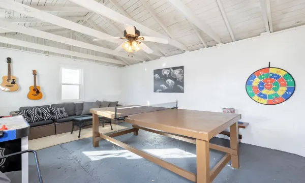 The detached garage game room offers hours of entertainment with ping-pong and board games, perfect for some friendly competition.