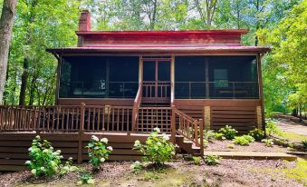 The 2-story, tin-roof cabin sleeps 14 and boasts 4 cozy bedrooms (a master on both levels!), 2 baths, a stocked kitchen, dining area. Enjoy the rocking chairs and hanging bed on the front porch. There’s also a swim pier, boat dock, fire pit, piano. Located 40 min from Birmingham. Bring your own boat (public boat launch five min away) or rent one nearby.