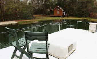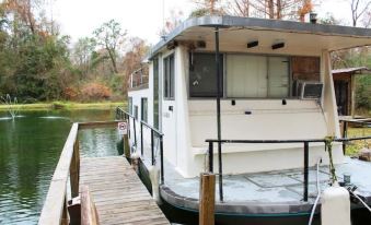 Welcome aboard our vintage houseboat at the Berry Creek Marina. Aptly named "A SHORE BET" this cozy 36'x12' Thunderbird houseboat is moored in our clear stocked pond alongside our 48' dock and will take you on an adventure of waterborne living without the hassle. Your boat sports a queen bed, full bed, full galley, head (bathroom for you landlubbers), sleeping-cuddy, salon, futon and a raised bridge with literally all the bells and whistles. You will also have access to our 2700' indoor/outdoor guest pavilion during your stay with too many extra activities to list.
