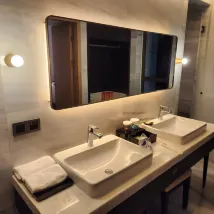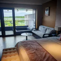 訂的是私湯豪華大床房,一開門就太驚喜了,房間很大,有獨立衣帽間和茶水間,浴室與衞生間分離,中間有雙洗手盆,陽台有私湯池和休息區,外面還有一個大平台。服務人員很友好,熱情有禮,晚上還有l夜宵送,住得開心,感到很滿意!