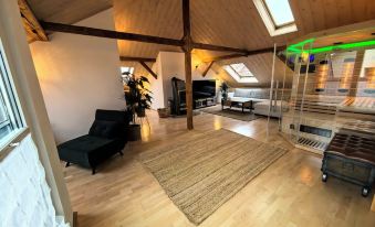 樓上設有一個寬敞的起居區,其獨特的屋頂橫樑清晰可見,此外還設有朝南的陽台、紅外線桑拿房、壁爐、遊戲室和書籍。帶睡眠功能的扶手椅可以舒適地並排擺放。睡眠區尺寸為154x191釐米。