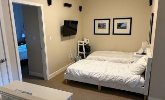 Powder room & full laundry downstairs. Large kitchen, with an island & dining table. Everything you need for your stay is in the kitchen if you choose to eat in.There are two full bathrooms in each bedroom upstairs. Four TV's, one in every room with cable and wifi. Large balcony facing the lake with a gas bbq & patio furniture for lounging. Enjoy the small back balcony as well for a view of Mission Hill.