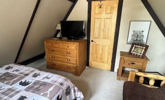 The second floor features a loft area, and a bedroom with a full size bed, TV with Roku and a DVD player, as well as a futon.