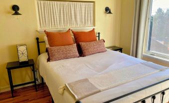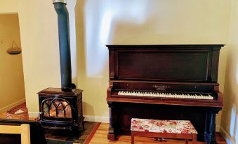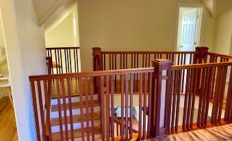 Our custom home features 4 cozy bedrooms, 2 bathrooms, artfully-crafted wood staircase, oak flooring and ceiling beams. A large slate entryway welcomes you with tons of storage. Step into a quiet reading and piano room that greets you. Guests can relax in the peaceful atmosphere of the house. The bright and sunny living room leads into the well-stocked chef's kitchen. Cupboards are full of full of stainless pots and pans, dishes, plenty of glasses and mugs. Also, complimentary spices, teas are available.