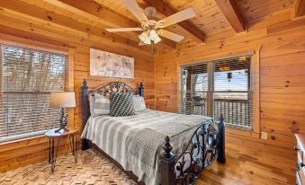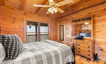 When you arrive, you are greeted by the impressive logs bearing up the covered front porch illuminated by rustic lighting. The front door leads to an open concept living space with a vaulted ceiling and warm wood finishes. A dining table and bar area accommodate eight guests, and the kitchen is equipped to accommodate home-cooked meals. The fireplace boasts a custom-carved mantle and employs gas logs for those cooler nights. Decompress on the deck and gather around the fire pit while taking in the twinkling lights adorning the mountains and valley below. A bedroom with a queen bed and a full bath with private and guest access completes the main level.