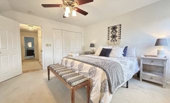 Upstairs has 2 large bedrooms, one featuring a large comfortable king bed, and the second with a comfortable queen bed. Perfect fit for a small family, group of couples or group of friends. Full bathroom with newly updated shower upstairs.