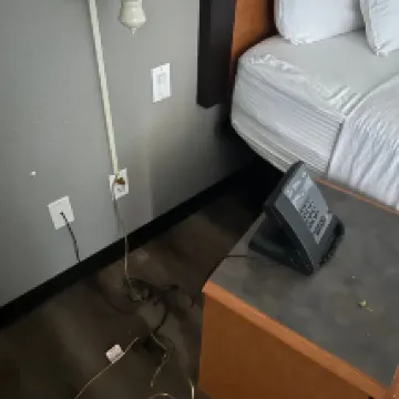 The photos online showed bright, modern, clean rooms. When we arrived, the rooms were much older. Didn’t have the same esthetic as the photos. The grey paint was chipping off the cabinets, the shower drain was rusty. There was an old empty set of doors that opened to the studs of hotel with torn drywall….really creepy… no purpose. The lights/lamps in the room didn’t work. I could only turn the bathroom light on and one other lamp. 3 or 4 didn’t work at all.