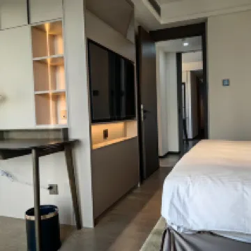 酒店很新,房間設計動線合理,簡約大氣舒適。樓下就是商場綜合體,還有個大型人氣超市很方便,出入地鐵絲滑。 公寓配置蠻齊全的,微波爐電磁爐,配有隔熱手套,鍋具、餐具等等實用物品,尤其適合家庭出行。 有兩點尚需改善的地方,走廊通往房間的温度過高,與前台的温差比較大,早餐可以再豐富些。 瑕不掩瑜,推薦給來武漢的朋友。