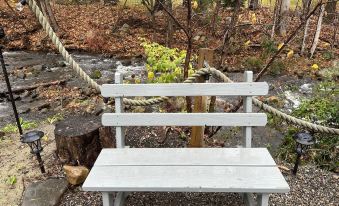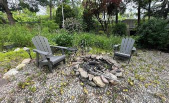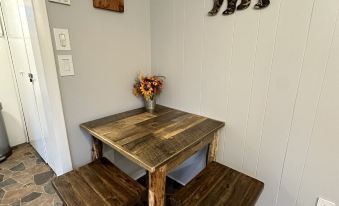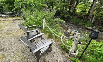 There is a front patio deck overlooking the property with benches. There are plenty of streamside outdoor seating areas including a picnic table, adirondack chairs, a bench, even a fire pit. Enjoy the propane grill outdoors if you wish. Or cook indoors in the full kitchen and use the small kitchen table.