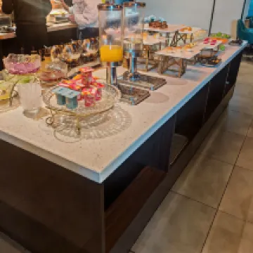 非常好的暫住體驗,晚上到店就把無窗升級成了帶窗房間,給了歡迎水果和小零食,大廳旁邊有熱毛巾和茶水咖啡,還有小點心 晚上有夜宵,麪很美味 房間大而寬敞,非常舒適,設施很齊全,給了兩種風味的掛耳咖啡,浴袍是兩件套罩起來放在衣櫃裏,其它拖鞋也是罩起來的,給人感覺乾淨衞生 早餐非常豐富,很好吃 晚上洗了衣服,貼了表情,第二天也幫忙烘乾了 電梯門口有瓶裝水可以取用帶走,很方便周到