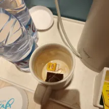 剛回到酒店,就看到續住的房間基本沒收拾。第一次續住時就漏補茶包也沒在意,第二次續住如下圖,杯子不洗,垃圾不扔,補的拖鞋亂擺,枕頭堆疊不透氣,牙線,頭髮都在地方,不能忍。 酒店地段雖方便的,大夏天客房樓層的走廊也沒空調。