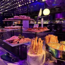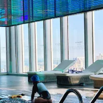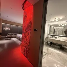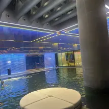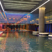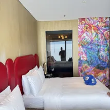 房間動線合理,衞浴乾濕分離;泳池與健身設施齊全,比較特別的是大堂還有甜品站、酒吧和藝術展。客房設計巧妙融合廈門在地文化,博餅主題貫穿細節:床鋪放置博餅骰子抱枕,迷你吧搭配骰子造型杯,搭配炫彩燈光與迷幻藝術牆,營造出時尚又不失閩南特色的沉浸式氛圍。服務方面添加了迎賓微信,Viola和柚籽也有一直在細微關懷我的入住體驗,滿分滿分滿分~