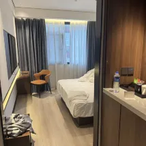 前台接待笑容特別親切,看到我們帶了小朋友,還幫忙拿了小童拖鞋和小童洗漱用品,貼心到心坎裏。房間空間比預期大,裝修是簡約輕奢風,暖光燈光顯得格外温馨衞生清潔絕對滿分,床品熨燙平整無褶皺,枕頭有軟硬兩款可選,床墊彈性剛好,睡起來完全不腰痠;衞生間乾濕分離徹底,玻璃門無水印,馬桶乾淨無異味,連洗漱台的縫隙都沒有污垢,淋浴熱水秒出,水壓穩定不忽冷忽熱。房間內設施齊全,有衣櫃可以收納衣服,還有小桌子,辦公或者吃飯都正合適,床尾還有小夜燈,很貼心。窗簾是雙層遮光款,隔音也很好,早上能睡個安穩覺;提供的茶包和咖啡品質在線,還配備了吹風機,風力很足。公共區域乾淨整潔,電梯裏有香薰不悶味,走廊鋪了地毯隔音效果好,完全聽不到外界噪音。退房時工作人員還主動詢問入住體驗,全程高效又暖心。性價比真的超高,很適合家庭出遊已經列入必住清單,很好推薦!