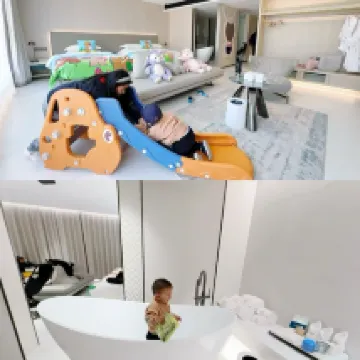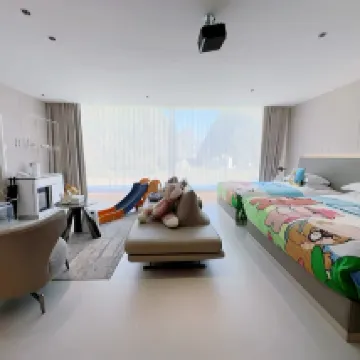 房間很寬敞回來也很乾凈!一整面落地窗把陽朔獨有的羣山"框"成了動態壁紙! 房間內還有小朋友玩的滑梯和樂高,兩個人也不用爭搶了!在一樓有小童樂園,海洋球、滑梯、VR等 還有孔雀、小兔子小萌寵,小朋友特別喜歡!酒店還有下午茶和民族服飾旅拍!真是適合親子住,完全不用出酒店,帶孩子就夠玩的了!