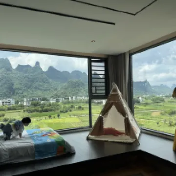 很美的酒店,入住的時候正好是週末,遇龍河的金龍巡有,第一晚在橋附近看的,第二晚在酒店房間也能看到遠遠的煙花。超值。 這家酒店有泳池,有電梯,租電瓶車方便,飯菜也很好吃。主要是量超級大。 真的很愛定的親子套房,躺在床上就是看山看水。 離富里橋和遇龍河金龍巡遊都挺近的,不過步行有距離。電瓶車可以。 推薦!有機會會再去的。