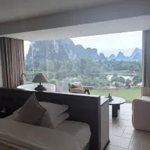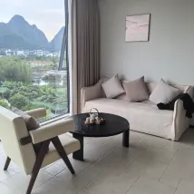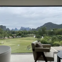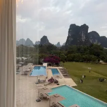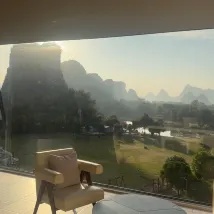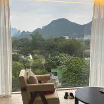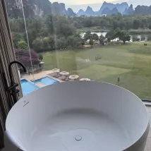 獨享一段遇龍河;從大堂出來,穿過兩個泳池,再走過一片酒店自有的大草坪,就到了遇龍河邊。坐在河邊的小屋或者桂花樹下,看遠近的山,看竹筏來來往往,風裡還有桂花的香氣。 房間很大,設施智能,音響很好。落地窗很乾凈,躺在床上、坐在沙發上、或者,泡在浴缸裏,都可以飽覽羣山跟河水。 服務也非常好,有求必應。入住的時候,小廖給了特別好的酒店和遊覽介紹。 這次沒在酒店吃午飯晚飯,但是早飯超出預期,尤其愛他家的粉還有艾葉粑。 總之,推薦。