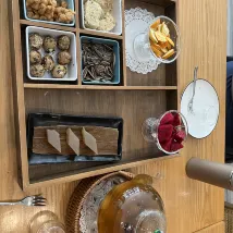 奔馳保姆車接或送不限次數(陽朔站、興坪古鎮):去哪裡都可以讓管家安排車送,服務真的很好,送我們去了鎮上,逛完又來接,又送我們去相公山的碼頭~ 精美下午茶:下午茶很好吃,很有儀式感,逛了一圈熱的有點發暈,回來吃上美美的下午茶真的太安逸了!對面的男人👨已經把它們吃光了,還順手買了凍幹橘子片回家吃 暖心夜宵:管家24小時值班,我們凌晨1點到的,車開到門口不知道停到哪裡,小哥突然出現跟我們説停在旁邊不用錢,原來一直在注意我們什麼時候到,看到有車開來立刻就出來引導了,真的很貼心!