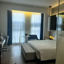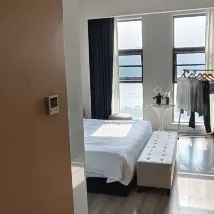 環境:臨近萬達廣場和江邊,散步逛街都方便,我選的望江方向,可以看到大橋。 設施:有健身房和洗衣間 衞生:房間乾淨,整潔。 服務:服務超出我的預期,有免費水果和糖果,瓶裝水就放在電梯間。我洗了衣服,服務員很貼心的幫我晾在窗口,還留了字條。非常值得推薦。