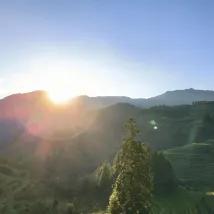 民宿就在白銀谷裏,離坑根村落很近,走路幾分鐘就到了,離主景區九曲連環開車12分鐘左右,老闆説看日出最佳觀測點在九曲連環,早上5點從民宿出發就行,如果起不來,睡在民宿的床上也能從落地窗看到日出。民宿在懸崖邊上,從房間的落地窗看出去就是山谷梯田,我們去的時候剛好下過雨,山谷裏雲霧繚繞,美不勝收。
