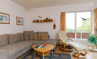 Apartment block "Düneneck", 3 storeys. In the resort 750 m from the centre of Zempin, 50 m from the sea, 50 m from the beach. In the house: storage room for bicycles, central heating system, washing machine (extra) (for shared use). Parking on the premises. Supermarket 4 km, restaurant 30 m, bakery, café 500 m, bus stop 550 m, railway station 600 m, sandy beach 50 m, thermal baths "Bernsteintherme" 4 km. Golf course (18 hole) 21 km, surf school 3.9 km, tennis 3.7 km, minigolf 3.8 km. "App.18 Düneneck", 2-room apartment 58 m2 on 1st floor. Cosy furnishings: living/dining room with 1 double sofabed and cable TV (flat screen), radio. Exit to the balcony. 1 room with 1 double bed and cable TV. Kitchenette (4 hot plates, oven, dishwasher, toaster, kettle, microwave, electric coffee machine). Shower/WC. Balcony. Balcony furniture. Side view of the sea. Facilities: children's high chair, baby cot. Internet (WiFi, free). Parking (1 car) at the house. Please note: non-smokers only. Maximum 1 small pet/ dog allowed. Smoke alarm.