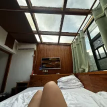 J'ai prit la chambre panorama au 5 eme étage, belle luminosité et énormément de place avec le lit qui est la taille de la largeur de la pièce. Vous pouvez également faire votre lavage gratuitement, vous devez seulement acheter votre propre détergent ( au magasin en face de l'hôtel).