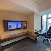 酒店位置不算理想,附近沒有商場,食店也很少,附近比較荒蕪,但酒店樓下就有7-11,補充簡單用品還是可以的。酒店房間尚算大,也乾淨衛生,泳池也算大,但由於酒店對外開放泳池,所以人很多,這樣不太理想。前台服務一般,沒有介紹酒店設施和使用時間,例如酒店泳池分兩段時間開放,職員並沒有於入住時說明,也沒有告知如需游泳,要先到前台領券再去泳池,累我白跑一趟。酒店內有健身室,但好像不供酒店住客使用,更像是在商場的健身室一樣,裏面人也很多,應該也是對外開放吧。