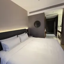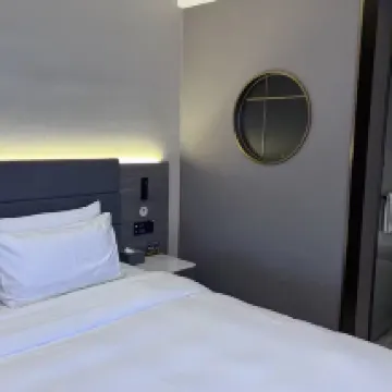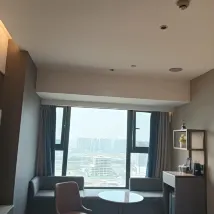 衞生:衞生挺好的,至少目之所見沒有看到不乾淨的地方,阿姨打掃的很細緻 環境:在一個大廈裏,前台略侷促,不是獨立電梯,樓上樓下可能是公寓和別的酒店,人員比較混雜,高峯時電梯要等,房間層都挺好的。 設施:房間佈局整體上挺合理,桌子的設計很好,吃飯辦公都很方便舒適,衞生間牆磚是黑色的略壓抑。 但是要特別説的是,房間的燈的按鈕夜裡也是常亮的,而且很亮!那個烘乾架上還有一個燈也是常亮,並且是閃爍的,即使拔了房卡也是!晚上房間就不是完全黑下來的,衹能自己都擋上。 另外,窗簾也不嚴,因為是電動的,晚上關窗簾就直接睡了,結果早上直接被亮醒了(如圖,一個超大縫隙),真的是煩躁。對這些光線敏感的朋友一定要在睡前檢查好。 隔音不好,半夜樓下説話聽的非常清楚,直接給我吵醒,凌晨3點多換房間……(25層不是這家酒店的,前台也無可奈何,衹有我自己換房才行) 服務:服務人員態度都很好,特別是半夜被吵醒,我以為是樓上或隔壁,前台小哥去看了,最後他告訴我説是樓下,他也很無奈,幫我換到另一側房間,還給拿來了眼罩耳塞。 早餐還行,油條挺好吃的,餐廳人員都很熱情。